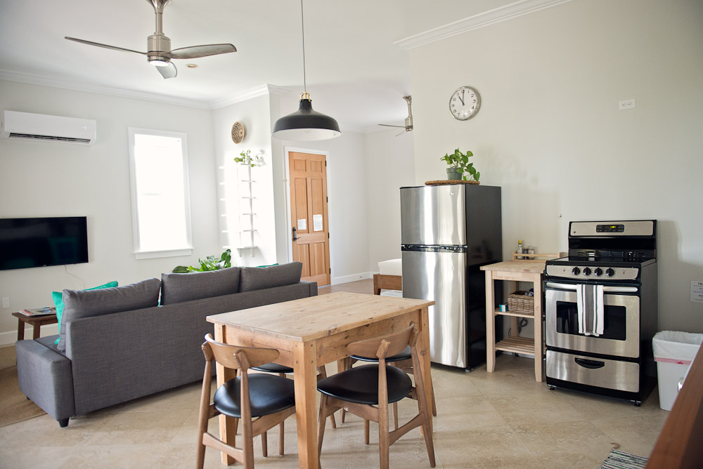 Loggerhead is a large open plan studio with separate shower room and walk in wardrobe. It has a European size king bed in the bedroom section with an additional sofa bed that can sleep up to two people in the lounge area. There is a large screened in deck with a hammock and seating area, sheltered by trees and overlooking the pool and outdoor play area. The kitchen is well equipped with washing machine and appliances to keep all the foodies happy. The studio is an annex to the main family house and comes with it’s own private entrance porch. A pack and play and high chair can be provided.